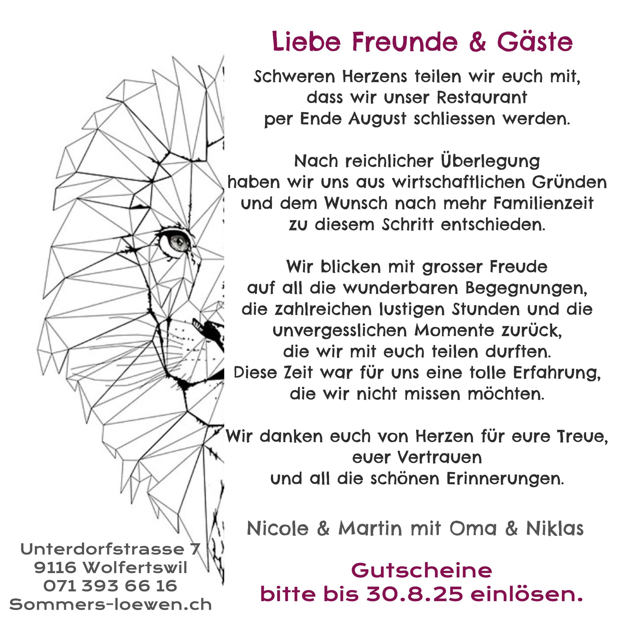 Entdecken Sie bei uns im Sommer's Löwen in Wolfertswil eine Oase der Gemütlichkeit und des kulinarischen Genusses, wo Herzlichkeit und Gastfreundschaft grossgeschrieben werden.
